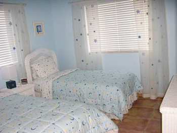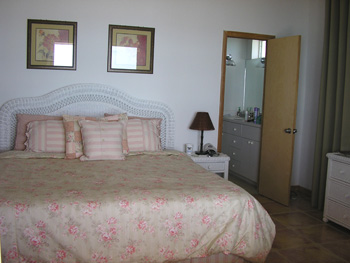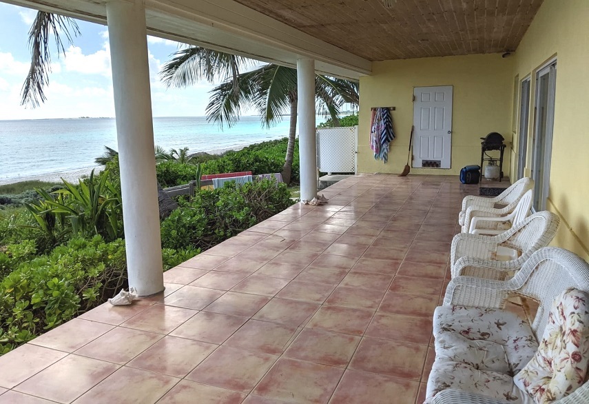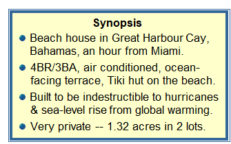 Completed in 2002, BolaBeach is a centrally air conditioned 4-bedroom 3-bath house on a private 1.32-acre property encompassing two beachfront lots. It was designed by me and custom-built to our specifications -- with a high cathedral ceiling in the Great Room and quirks like a bidet in the master bath. Sleeps 12, due to the two sofabeds in the Great Room. The large ocean-facing terrace and 15-foot diameter Tiki hut on the beach have fully-reclining lounge chairs with cushions; after you've seen the floor plan and pictures below, there is a link with more details at the bottom of the page. And the house is here to stay, able to withstand the most powerful hurricanes and even flooding from the worst-case sea-level rise forecast for this century (details here).