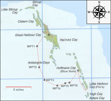 Ambergris Cays. These cays lie just south of Great Harbour and Haines Cay and provide a good stop-over on the way back from the Blue Hole and/or Flo's. The sand on the east coastline and the protection afforded by the islands to the east (Haines and Hoffman), result in a tranquil beach paradise. This is especially good for kids, even the smallest. We anchor at 25o 39.34'N, 77o 49.63'W, walk inland 50 yards or so and come to a shallow channel. If you go after high tide and enter the channel there, you will be carried at a swift pace towards the ocean, exiting at a sand bank not far from where you anchored. Then you do it again. Kids will do this for hours.Other Destinations. There is an airplane wreck in about 15 - 20 feet of water just off the beach in front of the Beach Club, easily reached with a dinghy; it's at 25o 44.74'N, 77o 49.74'W. There are beautiful reefs in 2 - 15 feet of water just east of Hoffman Cay; after visiting the Blue Hole, just go south bordering the west coast of Hoffman, turn east to pass between Hoffman and the small cay south of Hoffman, and then turn north on open waters for about a mile; passage between the two cays is fairly safe, just go slow (no-wake speed) and post a lookout on the bow (obviously, you want to do the same as you approach the reefs). Although fishing is great near GHC, the Tongue of the Ocean, just south of Chub Cay (see top map), is world-famous for its fishing; on a calm day you can go via the "first option" route defined below (on the outside, bordering the east coast of the islands), but a faster way of getting there (or if the seas are rough) is to take the "second option" below (inside the shallow waters of the Bahama Bank, diligently following a channel marked on current charts), but without turning southeast at Waypoint 3 and instead following the channel headed south all the way to Chub Cay (all the warnings cited below apply, such as up-to-date charts and good familiarity with your GPS).
