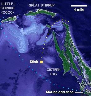 But there's a faster way, although somewhat more challenging. Shown on the satellite figure with yellow dots, it works for the size boats assumed here (30' or less). From the marina entrance you head to a marker "stick" at 25o 47.37'N, 77o 54.39'W, passing close to the southwest point of Cistern Cay. With the boat on-plane at 30+ MPH and the outboard engine(s) trimmed up, you pass just west of the stick moving north and do a little east-then-north jog to follow the sand trail for roughly 50 yards north of the stick. Then you head for the east tip of the small cay south of Great Stirrup (a good aiming point is 25o 48.53'N, 77o 54.03'W). The big advantage of this route is time -- you can get to the east side of GHC in about 15 minutes instead of 40.