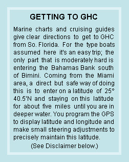In addition to the image at right showing boating directions TO Great Harbour Cay ("GHC"), this page has four boating trips from the island plus a few other suggestions. The first of the trips is a guided trip, but don't ignore it if you're a skilled boater, because this is a great adventure. The other three trips are unguided but can be made by anyone with even average boating skills; I cover first the destinations and then tell you how to get there. Several options are presented under "Getting There", some easy enough even for boaters with average skills, others more challenging. You still need to familiarize yourself with current charts. Generally, deep ocean lies to the east of the GHC and shallower water to the west (the Bahama Bank).For the unguided destinations I'm assuming an outboard-engined open-fisherman boat, under 30 feet, at 30 MPH. See the Disclaimer and Release at the end of this page.