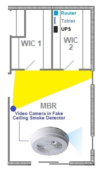 The various elements of this Option are shown in the image. At the Master Bedroom ceiling a fake smoke detector with a wifi-capable video camera is installed to observe the area around the Safe Room. A dedicated router receives the video via wifi and displays it on a tablet (e.g., iPad). The video camera, router and tablet are powered by an uninterruptable power source (UPS) larger than the one supplied with our "standard" Safe Room, so that the system functions even if intruders turn the house power off.