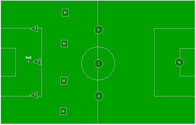 There are several points to this new alignment. First, it's sometimes called an "offside trap" formation, because it often causes the opponents to be offsides (and our backfields will signal the ref with an outstretched-hand signal when this happens). Second, it establishes our defense well away from our goalie, avoiding the old problem of a ball stopped and trapped near our goalie which suddenly squirts into the goal. But most importantly, it requires that the backfields be among the best players in the team. They must have the skills to stop the ball and the speed to overtake an opponent who gets through.TOPIC #3 -- POSITION