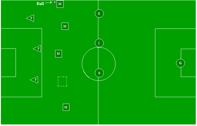 It's specially important that players cover the holes and figure out where they should be. This is a dynamic process which depends on where the ball is. In the figure below, the ball is on the sideline, about to be thrown in by our team, and the left midfielder is out of position, leaving a big area uncovered. A box in dashed lines shows where she should be. Think "in my area, where is the ball likely to be next?" and try to be there.
