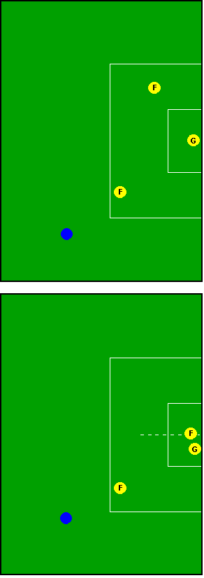 - More on position. While on this subject of position, look at the sketch at right. An opponent with the ball (blue) is approaching from the left. None of his teammates are around. We have only two fullbacks in the area. Our left fullback is advancing towards the opponent. What should our right fullback do? Stay in his "normal" position, as shown? What good is he there? Can he make a play from there? Of course not. As a minimum he needs to move towards the goal, as shown on the sketch below (notice that he is still on his side of the field, to the right of the centerline), or he could abandon his side entirely and head towards the opponent. But he can't stay in his "normal" position. So, think "where should I be to a be a playmaker?"